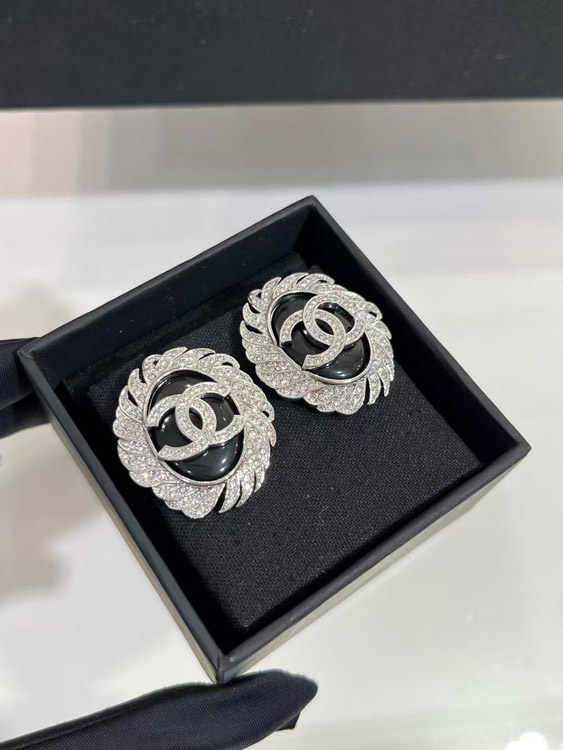 Home > Celine black oval button silver full diamond double C earrings-3900