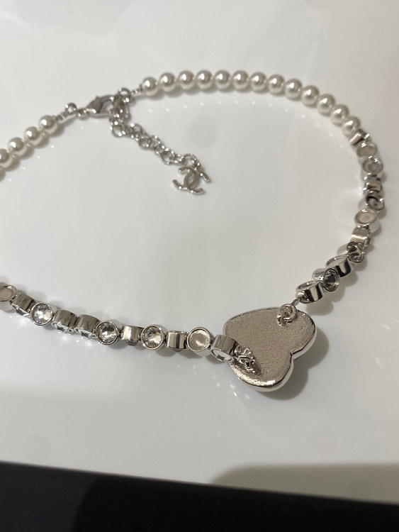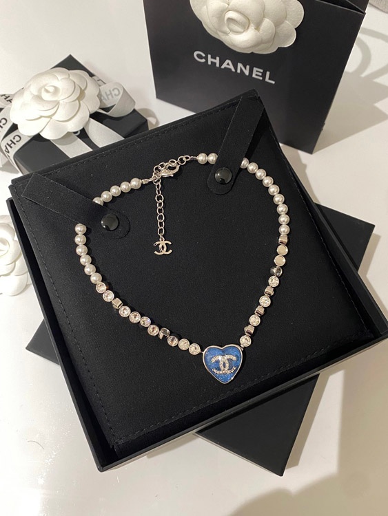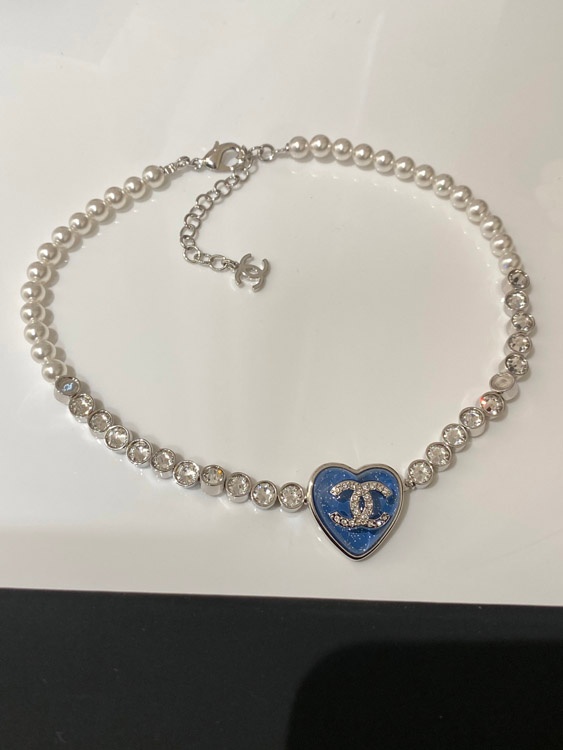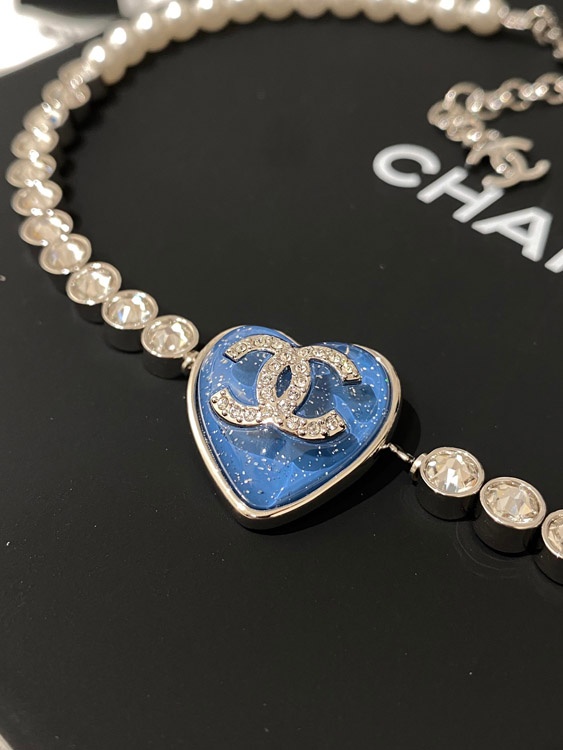 Chanel blue heart pearl rhinestone necklace-3594